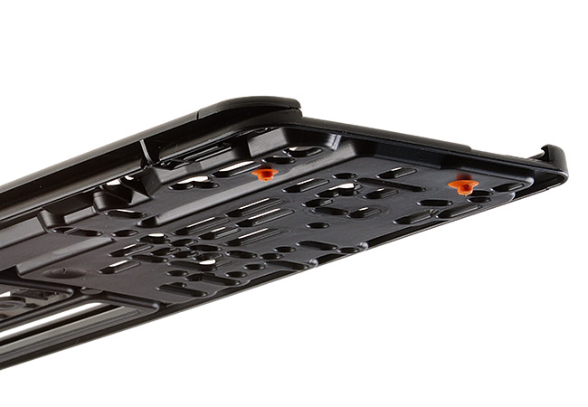 Benutzerfreundliche Montage - sicheres, schnelles Öffnen von vorne zur Abwendung von Lackschäden am Fahrzeug. Beispiellos einfache Kennzeichenanbringung durch die nach unten wegklappbare Werbeleiste. Nach dem Einschieben des Kennzeichens wird das Schild bereits durch zwei zusätzliche Brücken in der Verstärkergrundplatte gehalten; ab diesem Zeitpunkt haben Sie die Hände frei zum Verschließen. Selbsterklärende Bedienbarkeit.
