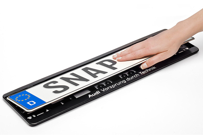 Perfekte Technik - einmaliges und innovatives doppelt ausgeführtes Snap-Verschlusssystem erfordert keine zusätzlichen Klammern oder lose angelieferte Leisten zur Befestigung des Kennzeichens.
