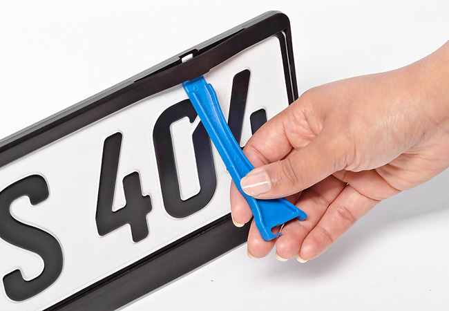 Benutzerfreundliche Montage - einfaches Einlegen des Kennzeichens durch schnelles Öffnen und Schließen von vorne zur Vermeidung von Lackschäden am Fahrzeug.