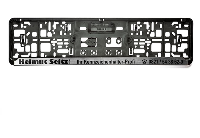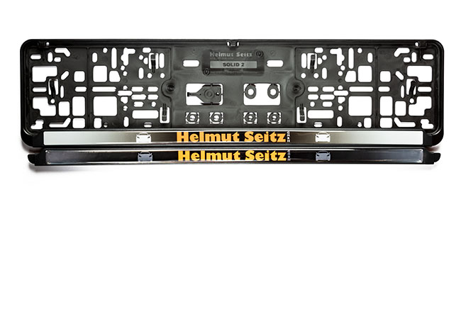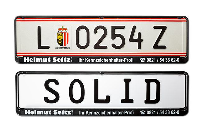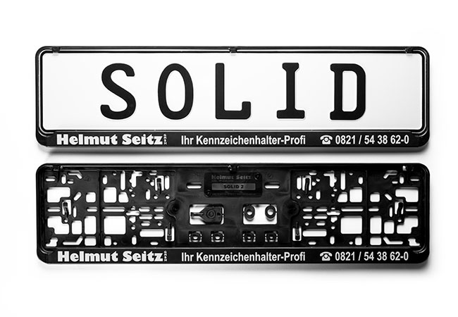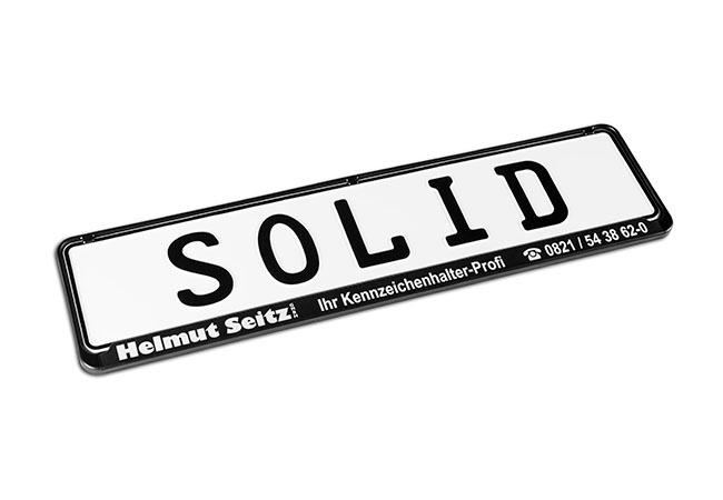 Solid Gruppe - die VielfältigenGrundsolide Technik - seit Jahren bewährt! Die günstigen Solid Halter mit Werbeleiste in verschiedenen Ausführungen. • Solid 2 - der gerade Standard (vormals: Solid Uni Pro) • Solid 2 gebogen - wie Solid 2, jedoch vorgebogen für gewölbte Stoßfänger (vormals: Solid "R") • Solid 460 - für das Kennzeichenmaß 460 x 110 mm • Solid Austria - für das Kennzeichenmaß "Österreich" 520 x 120 mm ...weitere Modelle auf Anfrage.