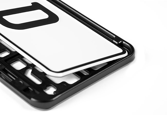 Benutzerfreundliche Montage - einfaches Einlegen des Kennzeichens durch schnelles Öffnen und Schließen von vorne zur Vermeidung von Lackschäden am Fahrzeug.
